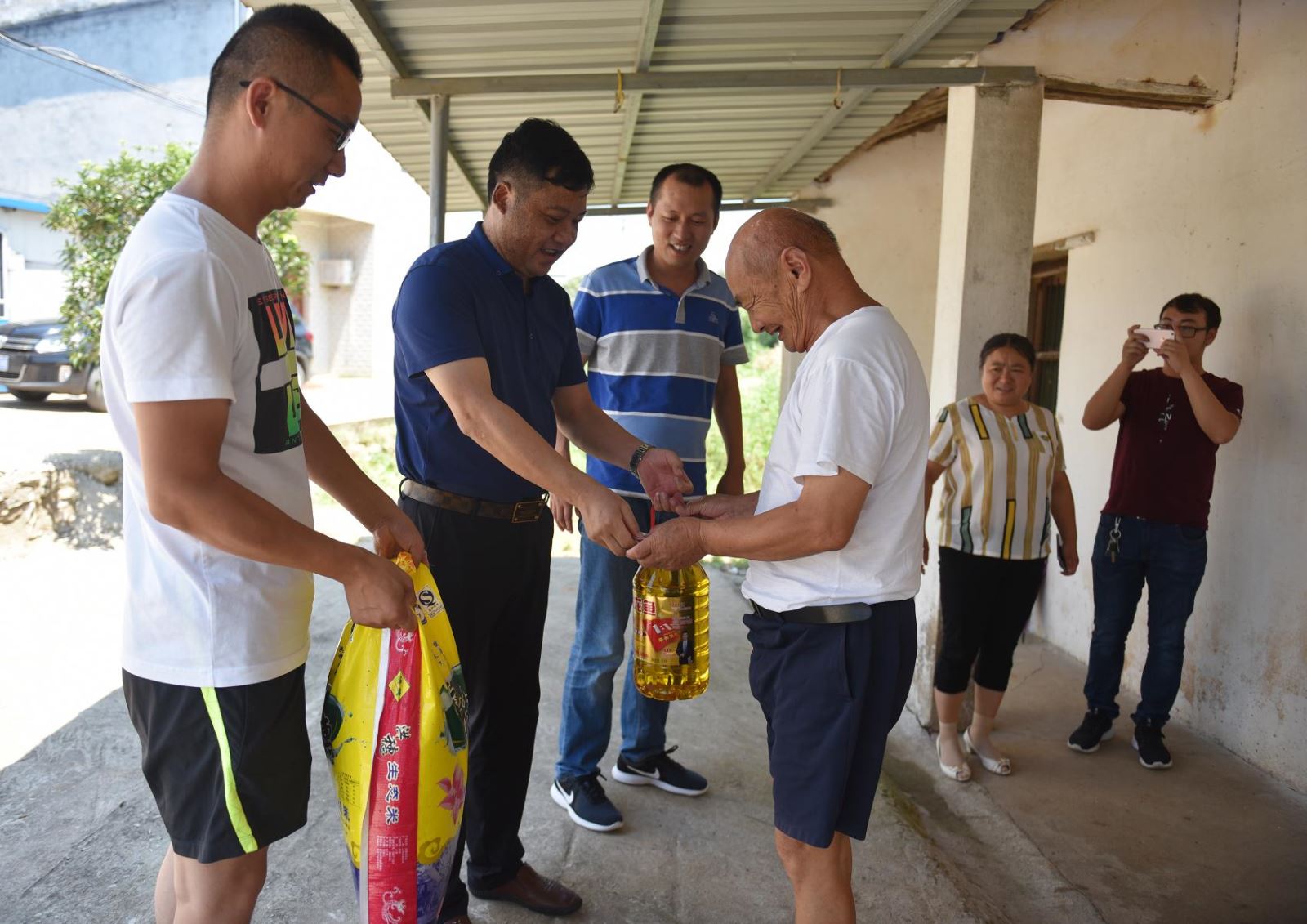 7月19日上午,由宿松縣政法委扶貧干部張劉旺帶路,該縣許嶺鎮(zhèn)雨嶺村外出創(chuàng)業(yè)成功人士張紹平,冒著36度高溫,在當(dāng)?shù)剜l(xiāng)村干部的陪同下,深入九姑鄉(xiāng)國賽村汪屋組看望慰問五保貧困戶汪承高老人,為老人送來了大米、食用油和慰問金,與老人促膝交談,仔細(xì)詢問老人家庭、收入等情況,表達(dá)了一名扶貧人對農(nóng)村貧困戶的關(guān)愛之情。